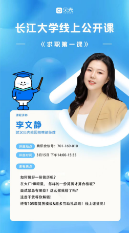 (通讯员 余珺瑞)2022年3月15日14:00,武汉贝壳找房科技有限公司校园招聘经理李文静受邀在腾讯会议为计算机科学学院学生开展就业指导讲座,我院2018级近四百名学生参加。