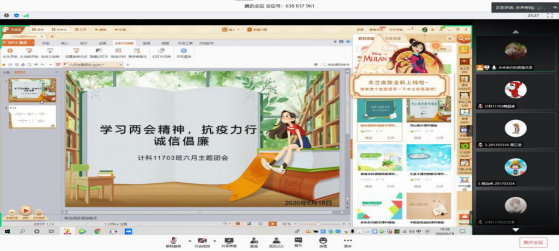 为深入学习贯彻习近平总书记系列重要讲话精神和两会精神,引导同学们关注两会,增强同学们的诚信意识和遵纪守法意识,计算机科学学院在6月以团支部为单位召开了“学习两会精神,抗疫力行·诚信倡廉”为主题的团会活动,活动时间为6月1日到6月20日。