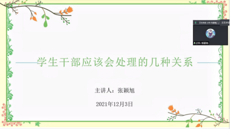 (通讯员:陈文博)2021年12月3日晚上18:30,计算机科学学院初级学生干部培训在腾讯会议上顺利召开。本次会议由计算机科学学院辅导员张颖旭、张茜,机械工程学院辅导员向如及化学工程学院兼职辅导员郭先哲主讲,各学院21级主要学生干部共同参加。