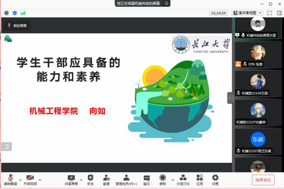 紧接着机械学院向如老师作出分享和指导,作为一名优秀的学生干部,在处理学干工作时要保证学习效率和质量,同时应该具有良好的政治素质,道德素质,知识素质和心理素质以及处理各种问题的能力。
