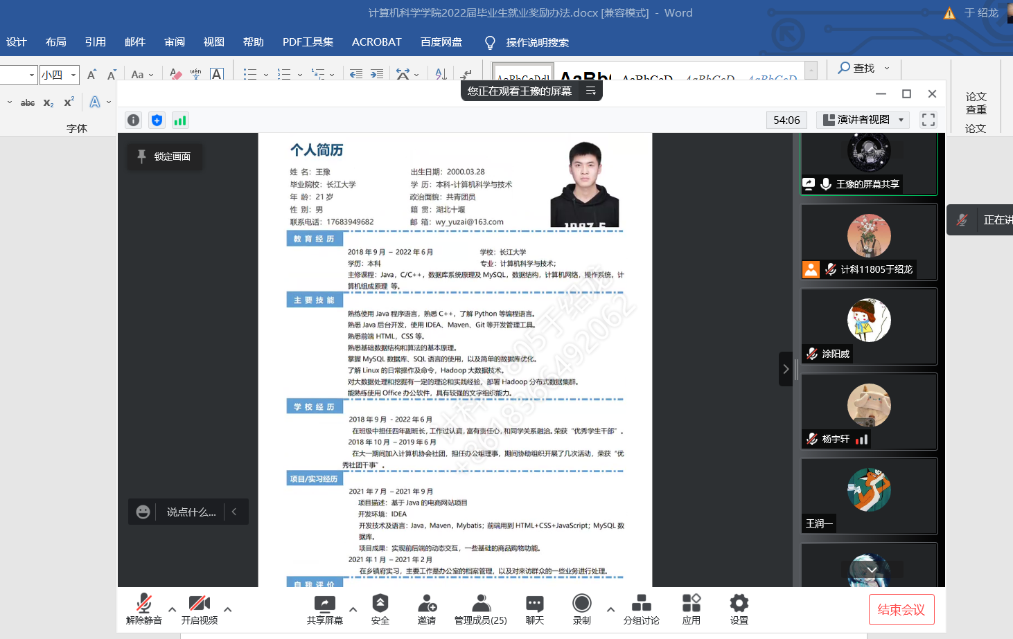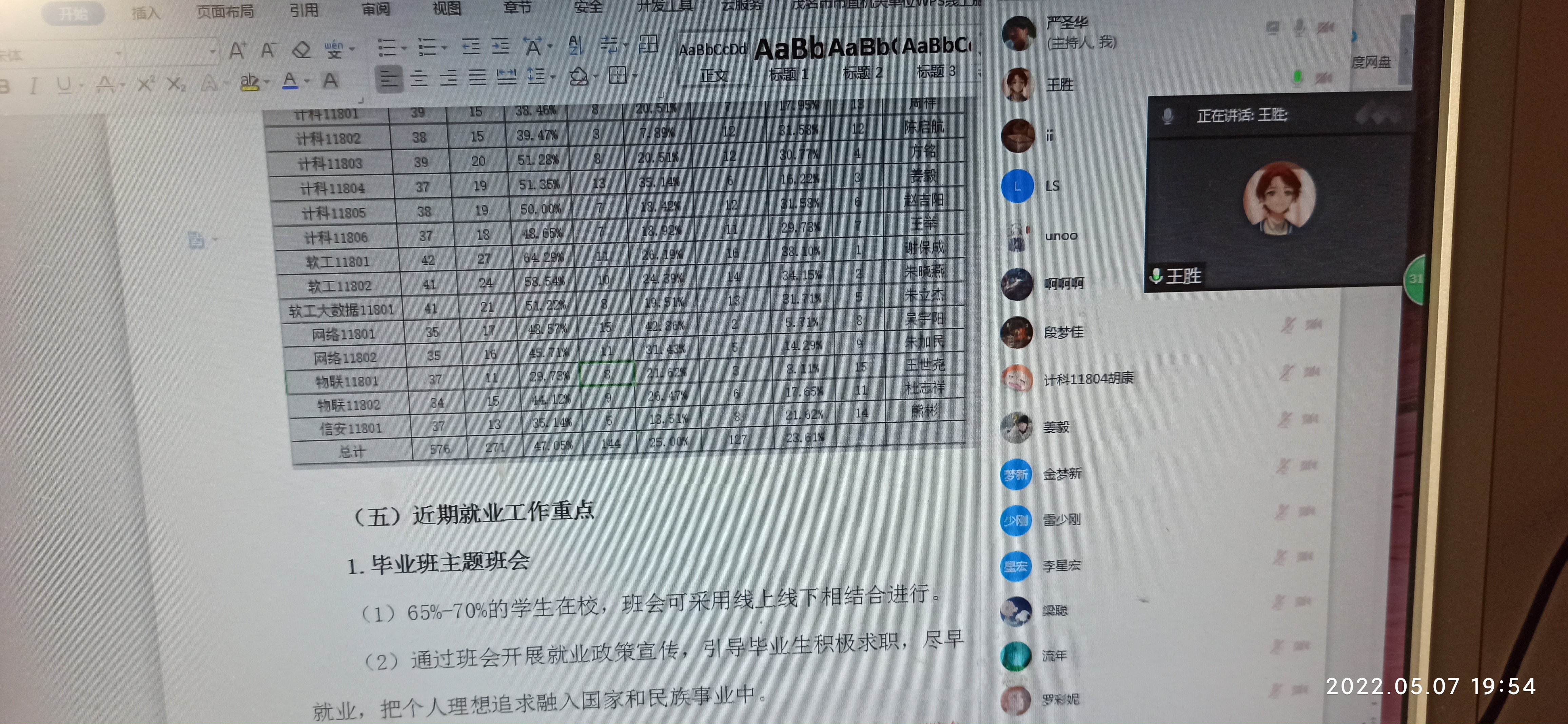 (通讯员 余珺瑞)为促进我院2022届毕业生就业、升学、离校等工作顺利进行,充分帮助同学们顺利毕业,5月7日—5月14日,计算机科学学院采取线上、线下相结合的方式开展2022届毕业生年级主题班会。会议由党委副书记颜学俊牵头,各班班主任主持,计算机科学学院2022届毕业生全体参会。