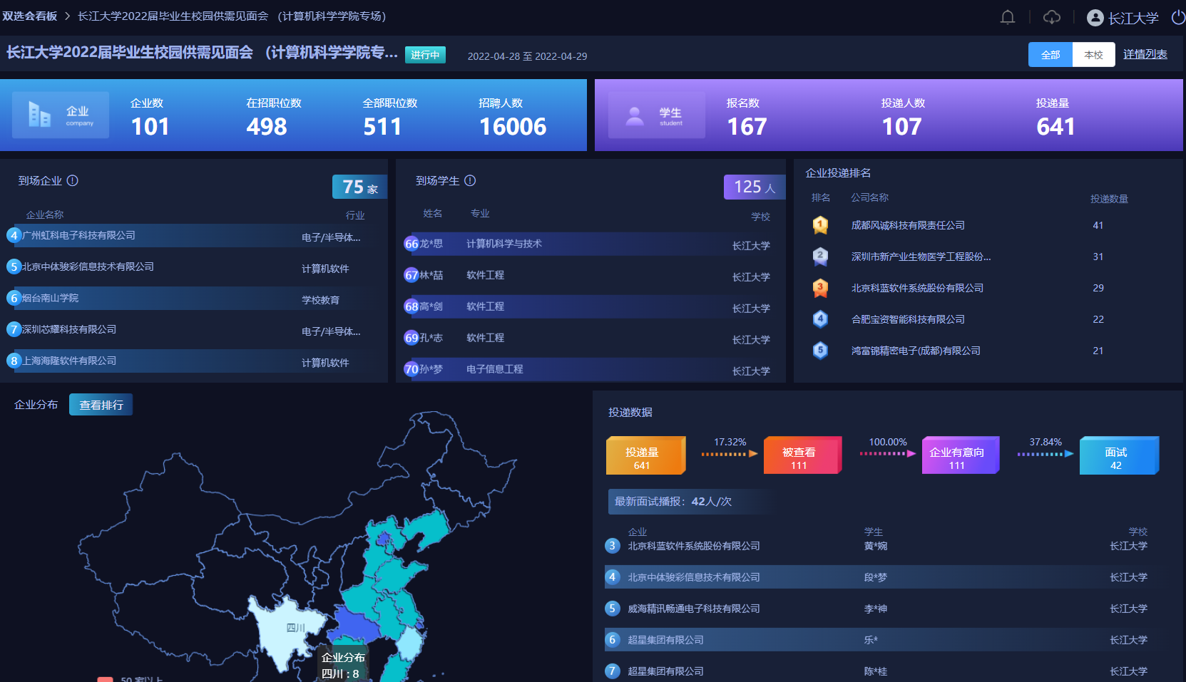 线上双选会邀请校企合作及校友企业101家,提供岗位数498个,招聘计划人数16006人。学生报名数167人,简历投递人数107人,投递量641,被查看111份,企业意向111份,被查看意向率达100%,面试人数42人,面试率37.84%,本次线上双选会企业数和学生参加人数多、成效显著。