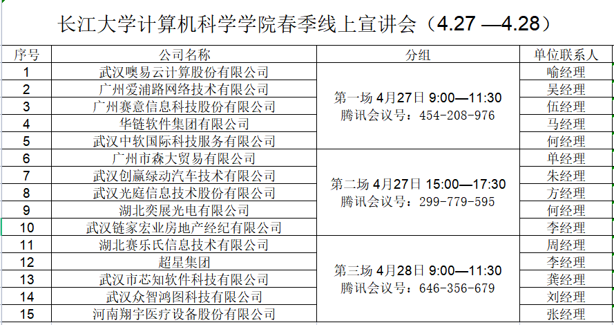 (通讯员 余珺瑞)为贯彻落实党中央、国务院“稳就业”、“保就业”决策部署,统筹做好高校毕业生就业工作,千方百计促进毕业生更加充分更高质量就业,解决困扰学生的就业难题,实现高校与企业的良性互动,计算机科学学院于2022年4月27日—4月28日举办了2022届毕业生春季校园招聘会(计科类专场)活动,本次活动采用“线上双选会”和“线上宣讲会”同时进行的方式开展。