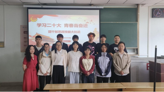 为深入学习宣传贯彻党的二十大精神,深刻领会习近平新时代中国特色社会主义思想,进一步加强全院学生思想引领工作,团结引领全院团员青年在思想淬炼和精神洗礼中锻造坚强党性、筑牢思想之基、补足精神之钙,坚定信念跟党走,勇做新时代新征程奋进者,4月25日下午14点,计算机科学学院团干部思政技能大比武在13教—b—107举行。学院分团委书记张茜,辅导员郭帅、蒋代运、艾思含参与本次活动。
