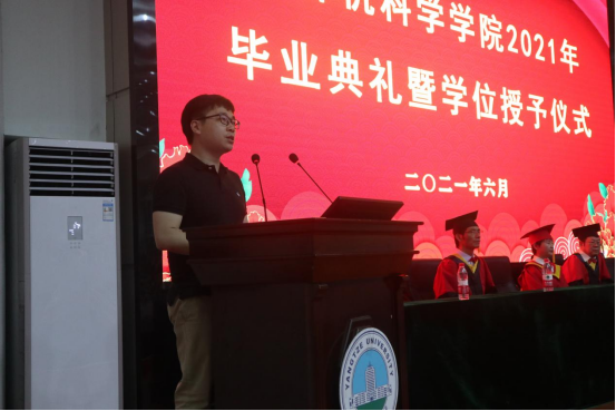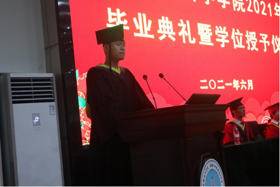 随后,学院本科生、研究生毕业代表依次上台发言。董阿兵谈到了这四年来大家的进步:我们努力践行“长大长新”的校训,学会了去求知,去探索,去宽容,不断超越,不断成长;卞珍怡回顾了在校历程,并深深地感谢父母、感谢导师、感谢同学;胡月像论文一样给自己三年的时光添加了两个关键词—“不舍”、“感激”,表达了自己对母校深深的眷念之情。
