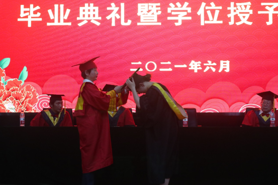 在毕业生学位授予仪式环节,身穿学位服的硕士毕业生、本科毕业生依次走上主席台,崔艳荣教授为每一位毕业生扶苏拨穗、授予学位、颁发证书。最后,学院毕业典礼在一曲带着离别思绪的《毕业歌》中结束。