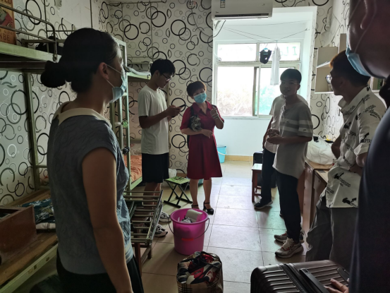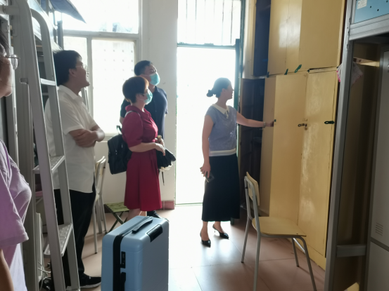 当日下午,学院院长崔艳荣、党委书记黄群俊、党委副书记颜学俊与辅导员张颖旭一起走访了学生寝室,与学生亲切交流。
