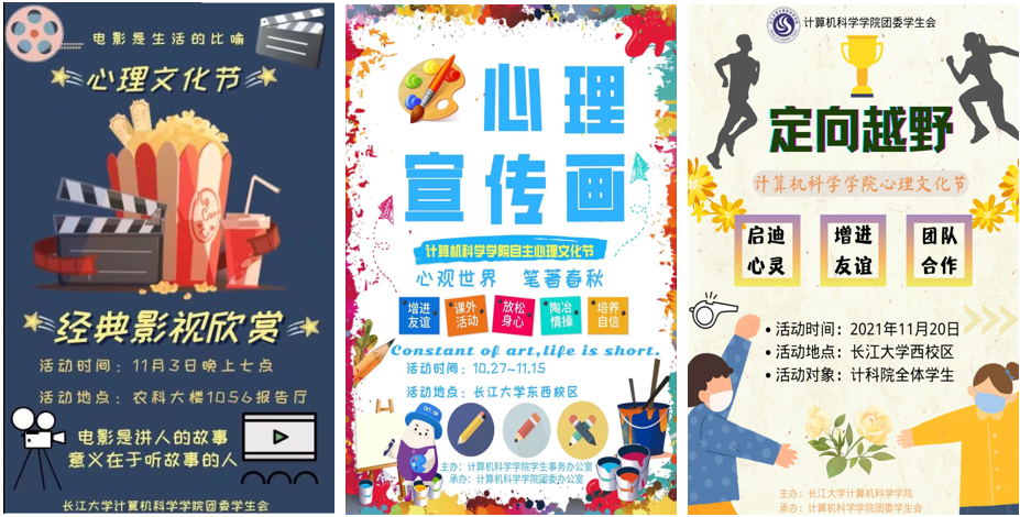 (通讯员:张颖旭)一生温暖纯良,不舍爱与自由。计算机科学学院于2021年11月中上旬,顺利开展学院第六届心理文化节。此次文化节由三个子活动组成,分别是:沉浸心灵之旅——观影活动、共筑“心”青春——心理宣传画活动、智慧启迪心灵——定向越野活动。