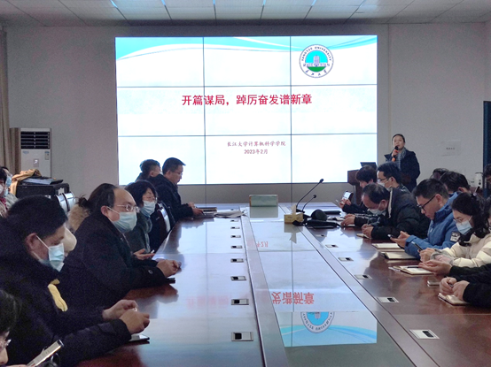 崔艳荣院长部署了学院2023年重点工作,从学院和个人两个角度出发,详细列举发展目标、规划方向、实现路径、落实方法。崔院长指出,个人成果汇成学院成就,学院成就惠及个人发展,学院、个人互相支撑。她鼓励全体教职工开篇谋局、踔厉奋发,谱写计科新华章!