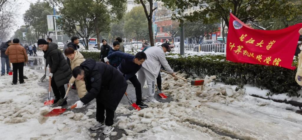 天寒雪飘,情暖荆州。风雪依旧肆虐,计算机科学学院将时刻关注天气动态,以雪为令、勇于担当,为保证校内外出行安全、市政道路畅通而继续努力。