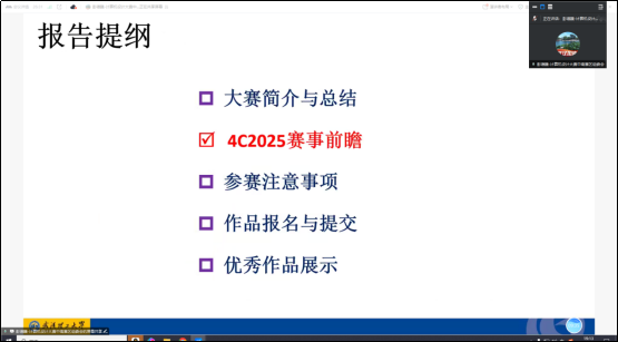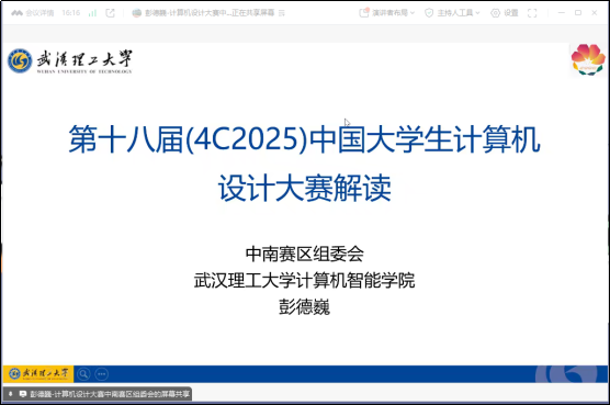 2025年3月26日,武汉理工大学彭德巍副教授在腾讯会议平台上为我校师生做了第十八届中国大学生计算机设计大赛赛事解析和参赛指导。本次会议由计算机科学学院副院长陈中举主持,报名参赛的学生和指导教师参加了此次会议。