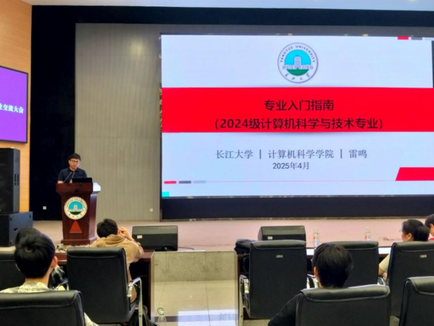 2025年4月28日晚7点至8点30分,计算机科学学院计算机科学与技术专业于农科大楼1058学术报告厅成功举办2024级新生专业交流会。计算机科学学院院长崔艳荣,院长助理兼计算机科学与技术系主任雷鸣,副主任张凯、代江华,新引进的博士后张玉繁,学工办老师蒋代运,为2024级计科专业全体230名同学介绍专业发展与成长规划,会议由雷鸣老师主持。