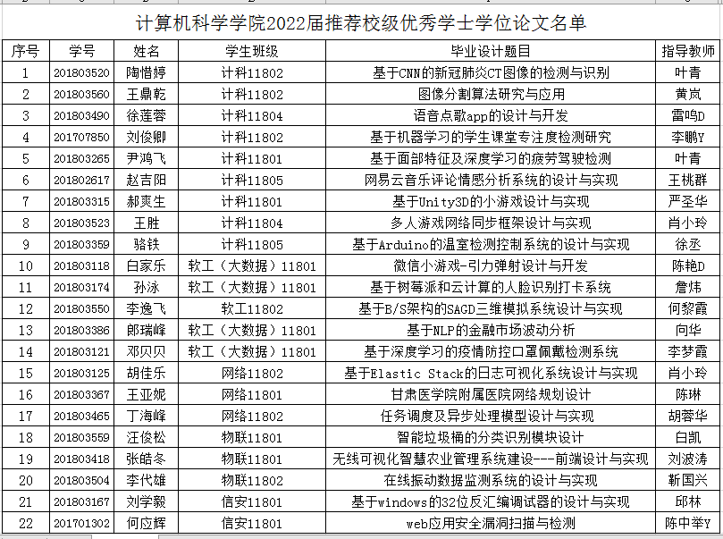 计算机科学学院2022届推荐校级优秀学士学位论文名单公示