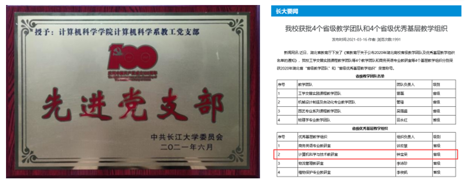 近期,我院计算机科学与技术系教工党支部荣获荆州市“红旗党支部”称号,并成功获批为304永利集团登录入口党建工作样板支部。同时,研究生第一党支部也荣获校级“研究生样板党支部”创建单位。