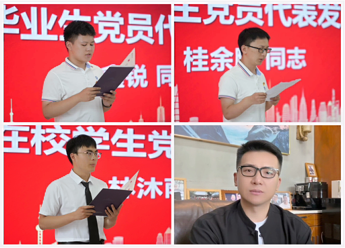 毕业生党员代表王鑫锐、桂余鹏表示,无论投身科研还是扎根基层,都将把个人理想融入强国建设,让青春在现代化国家建设中绽放光彩。在校生党员代表林沐雨表示将传承"科创报国"基因,接续奋斗。优秀校友郭亮期望大家在工作中情绪管理、坚持学习和培养韧性,不断提升情商、智商和逆商,在科技创新和数字中国建设中勇挑重担。